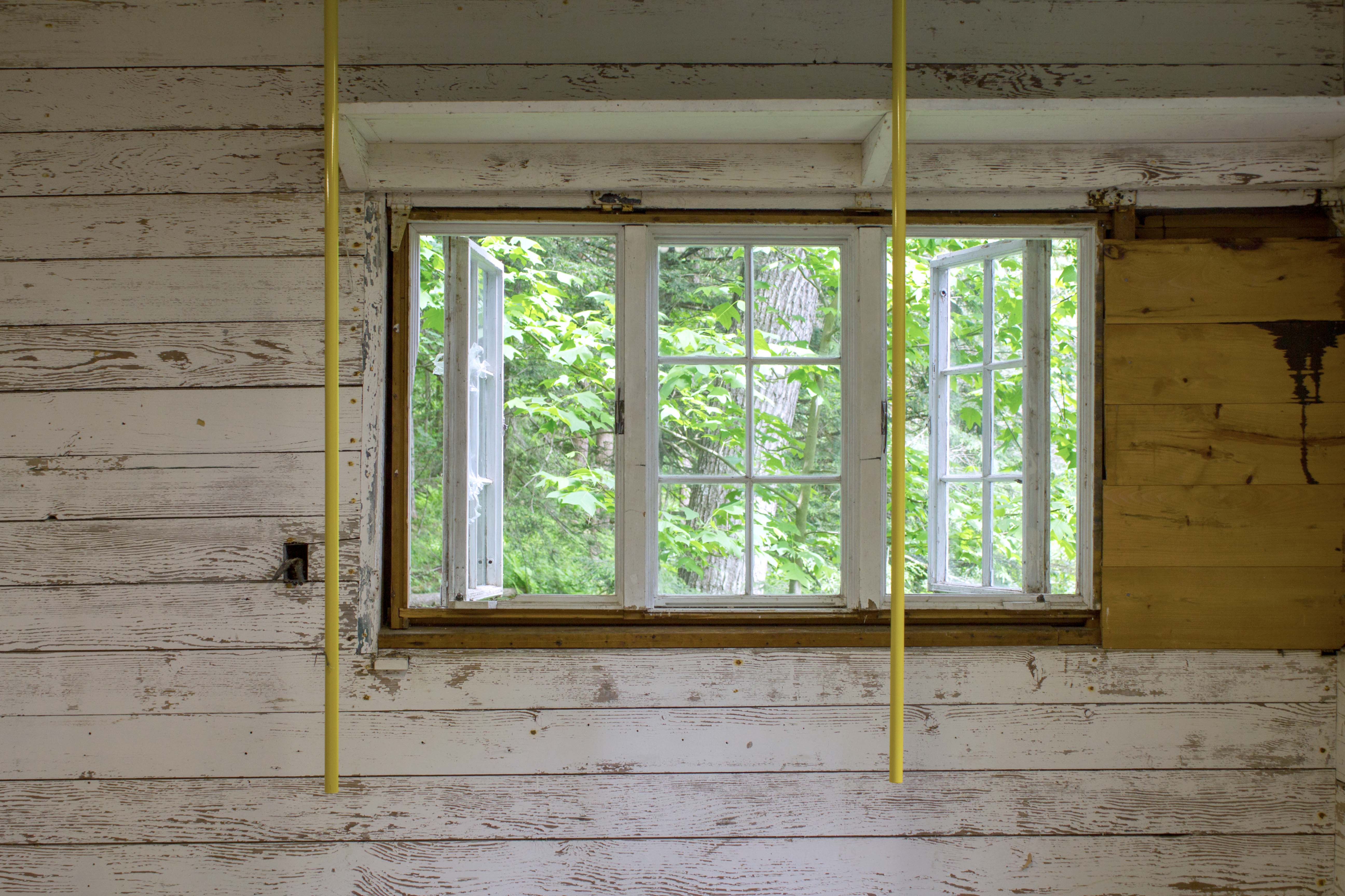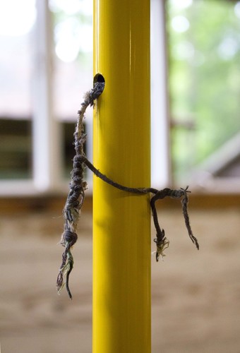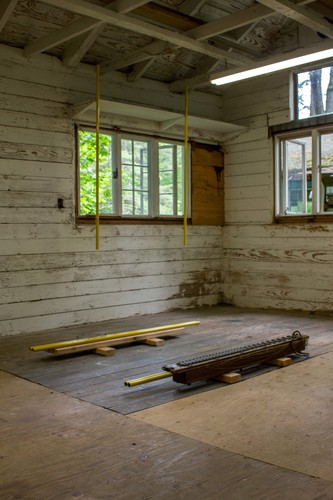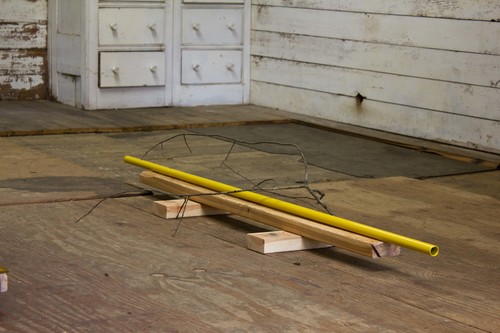 Our bell, here at GERTRUDE, is whatever we want it to be, like a window cut to our size. It’s the breakroom for the servants that used to care for the residents here, it’s the lunch bell, it’s a home for birds and spiders, it’s the school bell, it’s the church bell, it’s Pavlov’s chime. It reminds us of when sound and space were connected through the social. On Matthew’s lengths of steel, two holes allude to a remote function—they’re cleats or keys on a flute. Each section is an apparatus on which future structures depend, or by which a single measurement is made. Signifiers of function are bound up with definitive and divisible sets of numbers, and systematic language. Here, the measurements of the steel tubes have been determined by the width of Matthew’s outstretched arms, and we can imagine him carrying them, one at a time with his arms extended to their maximum span. The tubes are phrases, measures, a room poem—changing every time its performed. The hands that move them are conduits all unto themselves.